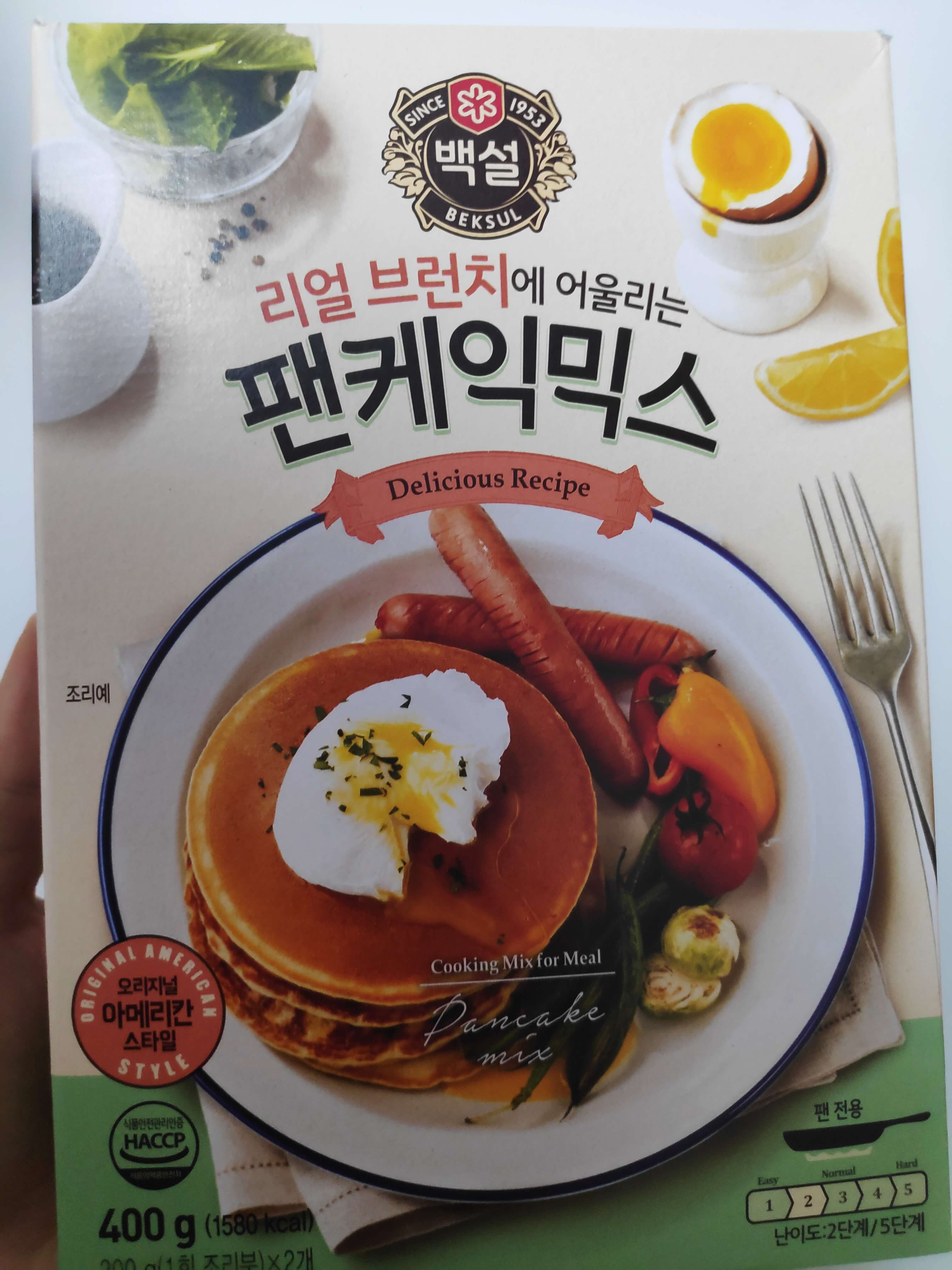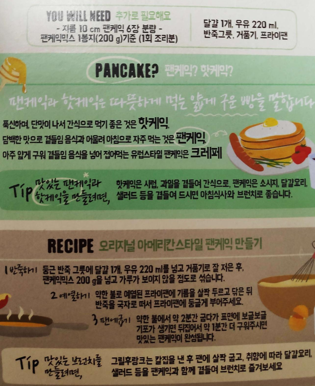 믹스 1봉지, 계란1, 우유 약200ml = 팬케익 6장(2인분)
