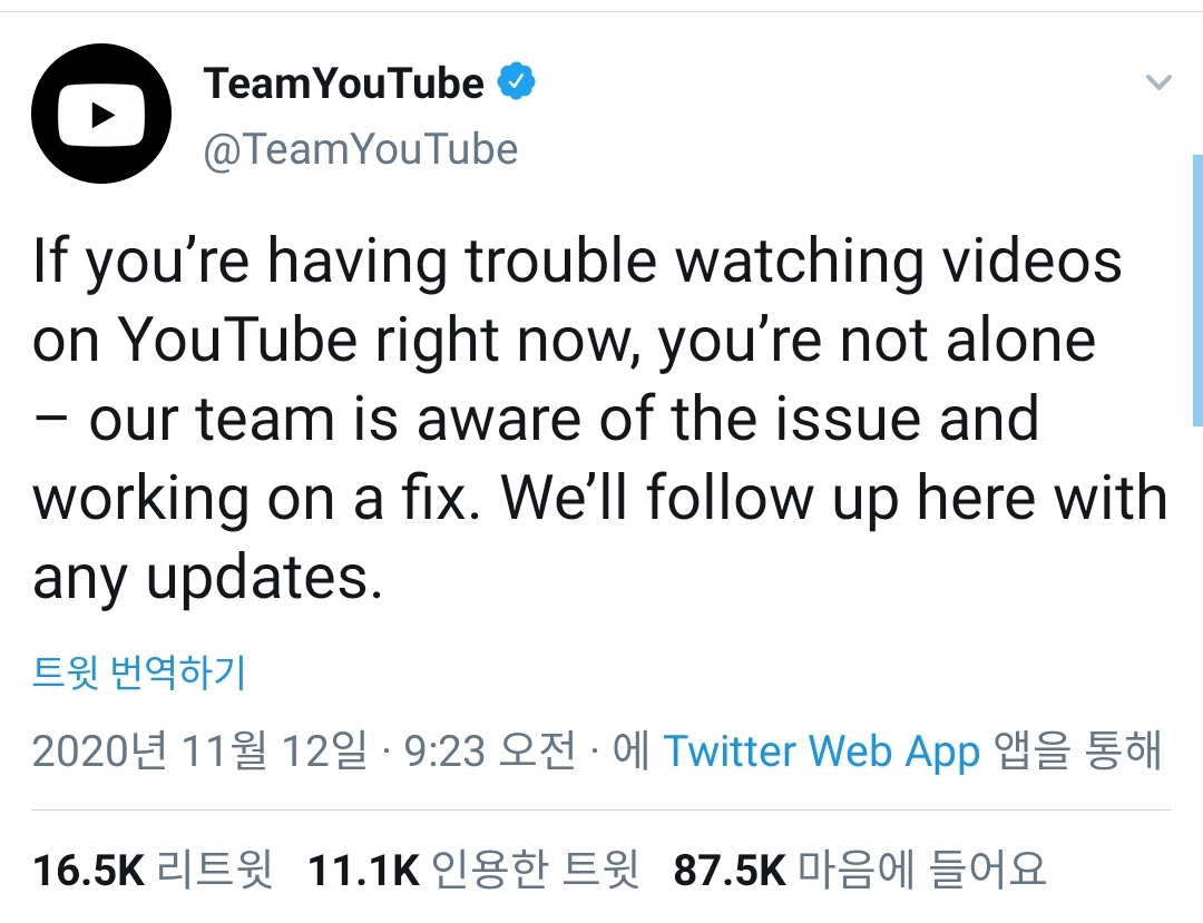 그렇게 전세계 이용자들이 불편을 겪고, 신고접수가 수십만건이 쌓이자 9시 23분에 유튜브 측에선 공식 트윗 계정으로 조치를 취하는 중이라며 입장을 내놓으며 이용자들을 달랬는데요.