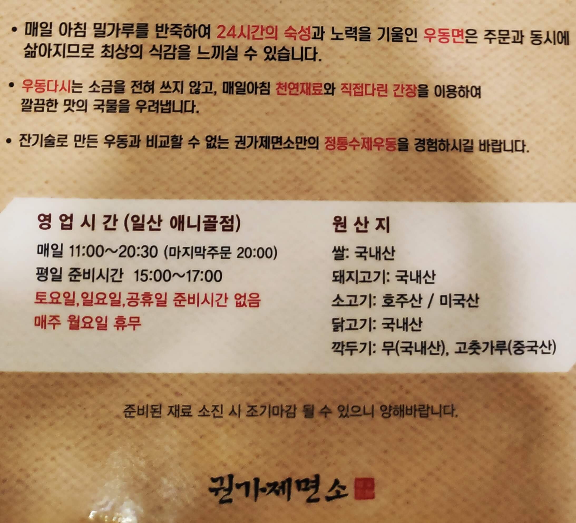 마지막으로 메뉴판 뒷면 하단에는 권가제면소의 우동면에 대한 설명과