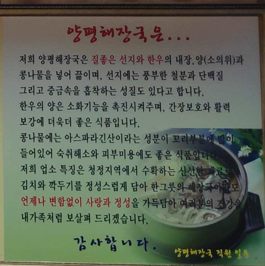 메뉴판 옆에 나와있는 양평해장국에 대한 소개입니다.