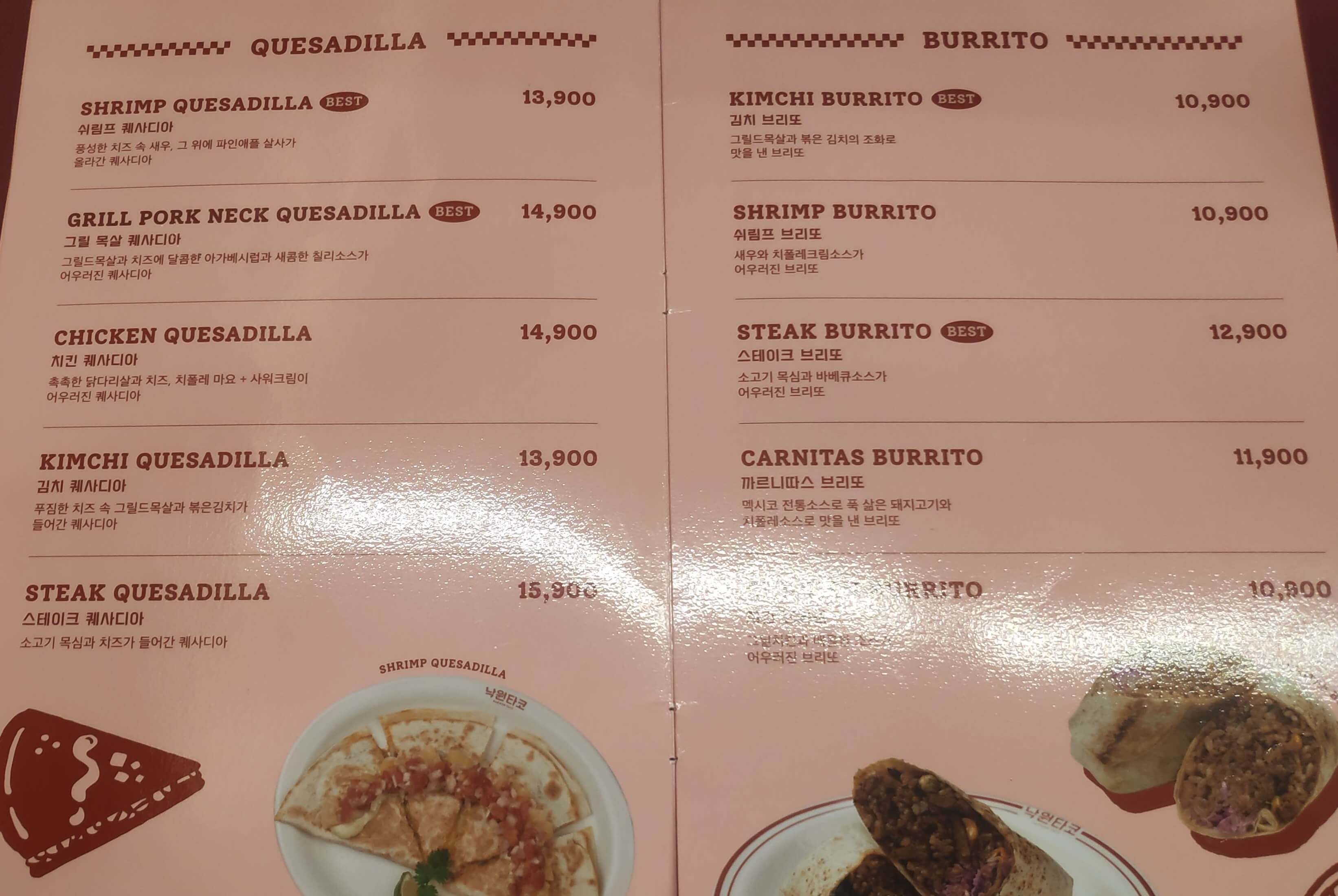 김치, 쉬림프, 스테이크, 까르니따스 등이 있습니다