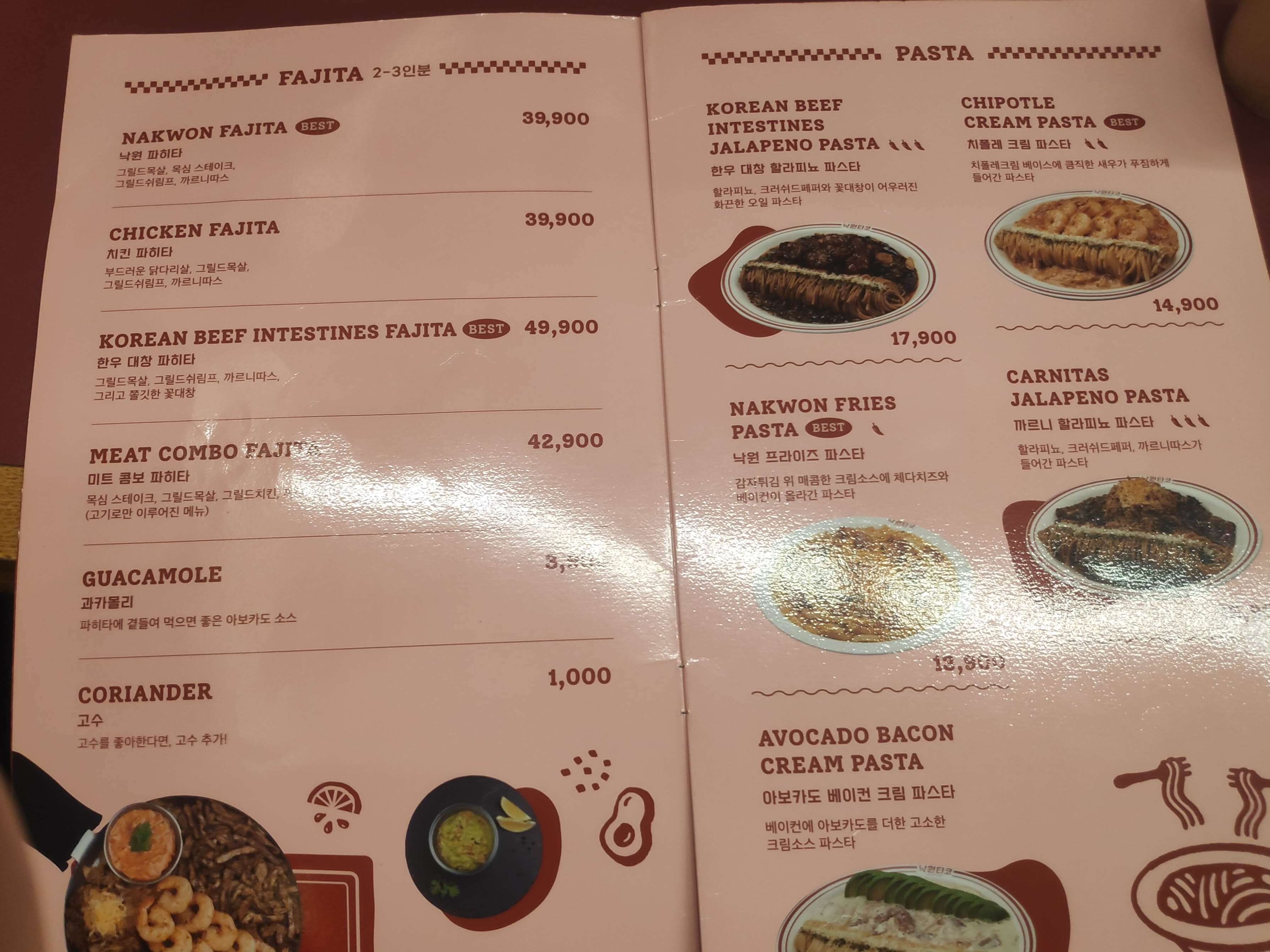 첫 페이지는 파히타와 파스타입니다.